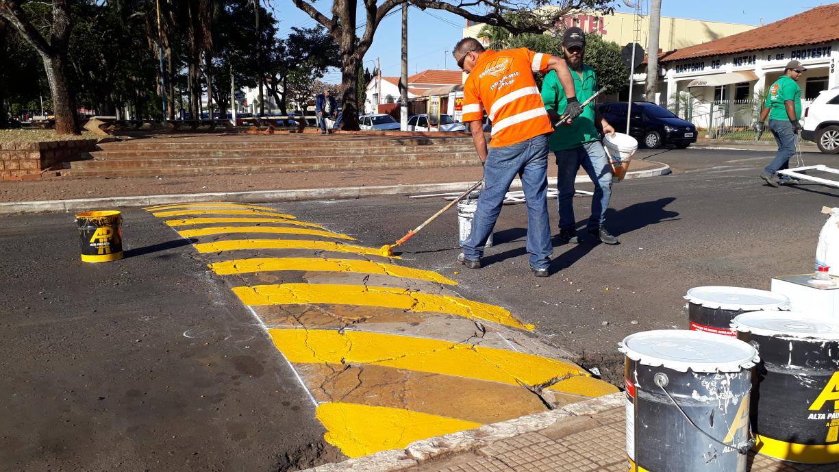 Estão recebendo pintura nova todos os locais que demarcam as paradas de ônibus escolares, áreas reservadas a idosos e portadores de deficiência física, pares, faixas de pedestres e lombadas.